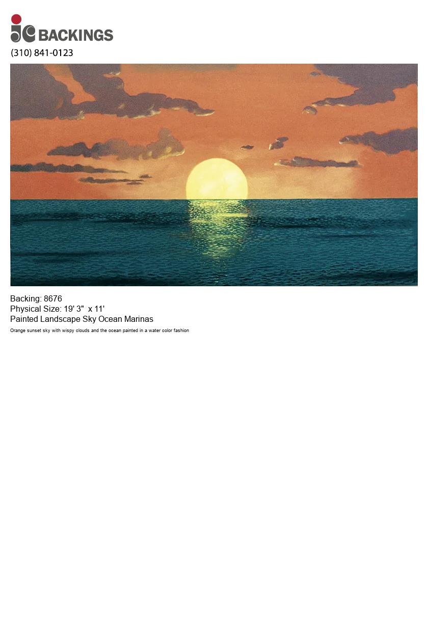 Orange sunset sky with wispy clouds and the ocean painted in a water color fashion