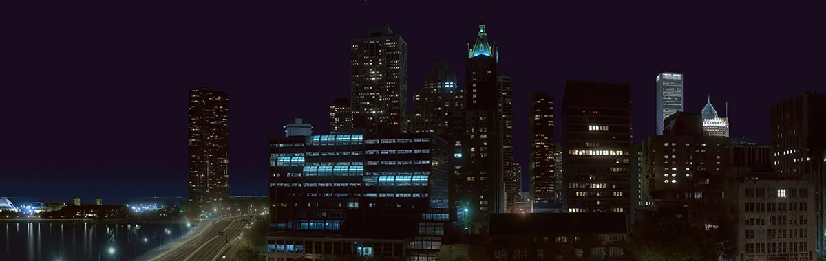 Chicago at night from a 14th floor view of the Chicago downtown city skyline and lake Michigan