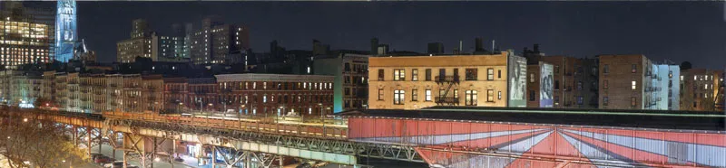 NY N.Y. New York downtown city buildings at night from a 7th floor view of skyline with elevated train tracks in Spanish Harlem at 125th street and Broadway