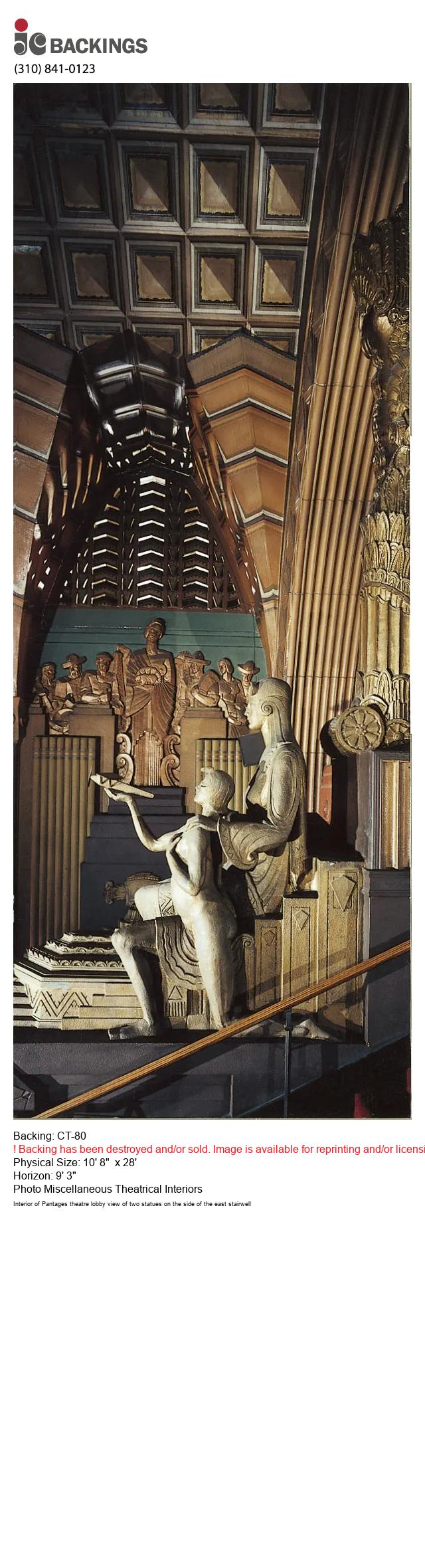 Interior of Pantages theatre lobby view of two statues on the side of the east stairwell