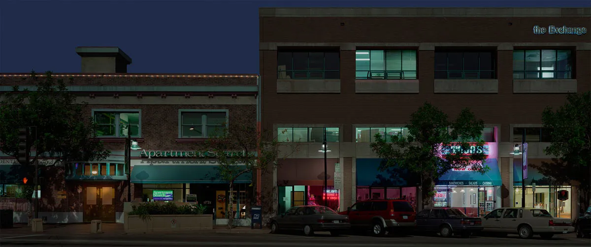 Day first floor view of commerical store fronts and a theater in Glendale California