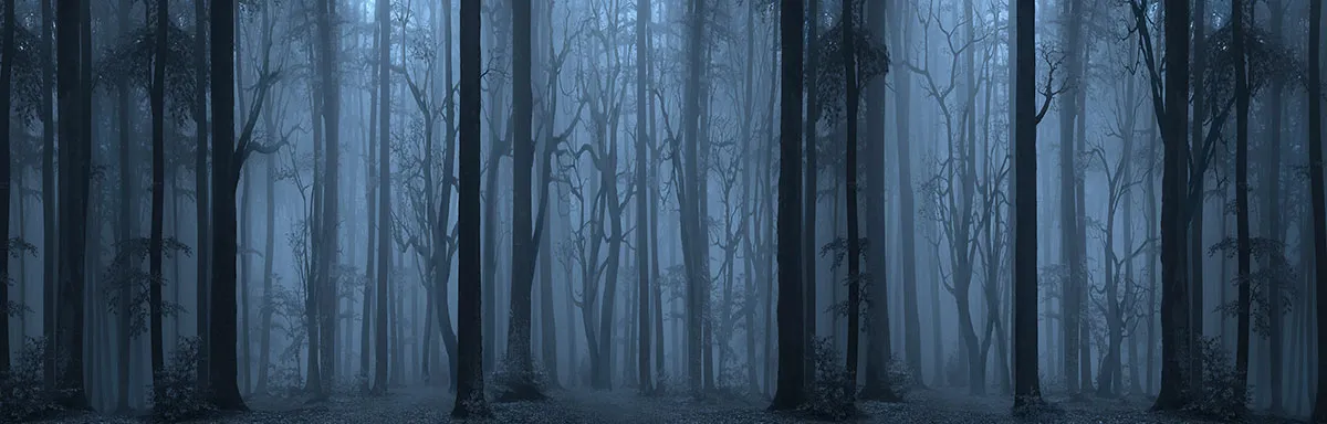 Keywords: night spooky foggy forest menacing twisted tree trunks