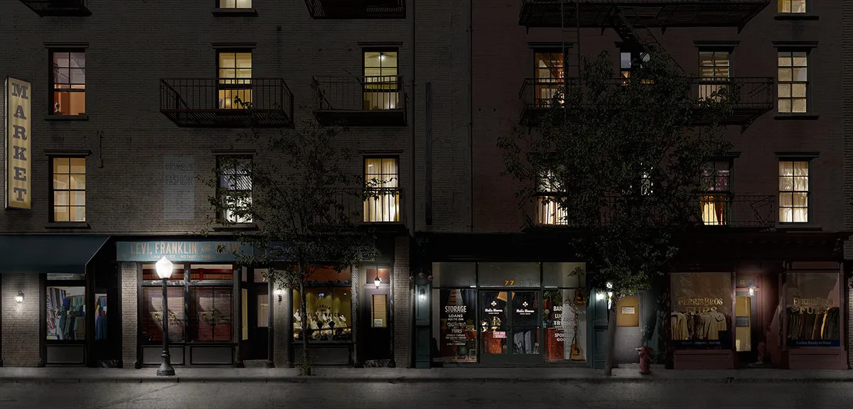 Keywords: Night Warner Bros Brothers WB backlot back lot street level commercial Hennesy store fronts