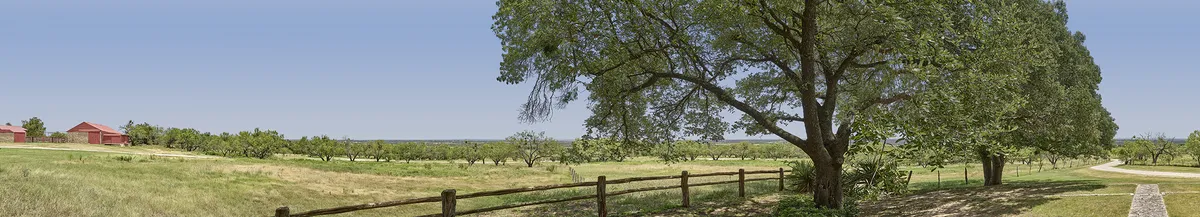 Keywords: day daytime green brown grass trees barn fence dirt road blue sky