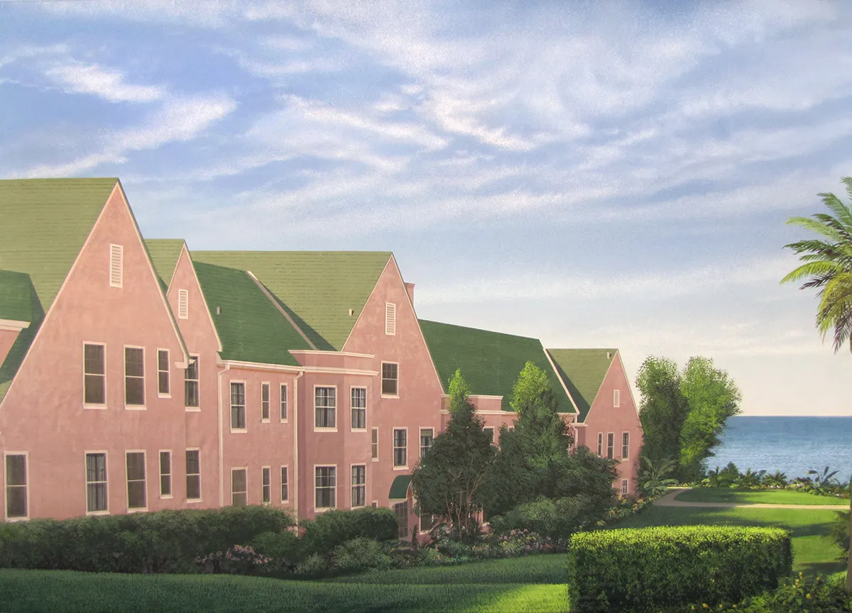 Keywords: Day Daytime architecture pink two story building landscaped lawn palm trees green trees ocean view blue sky white whispy clouds mansion resort hotel home condos