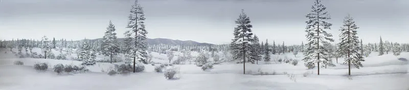 Keywords: snow covered snowy winter landscape hills rolling trees tree bushes bush shrubs shrub shrubbery day clear blue grey gray sky forest forests pine pines distant mountains mountain