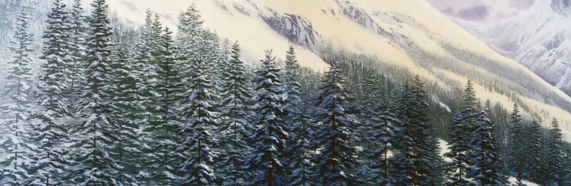 Keywords: snowy snow covered winter landscape trees tree green sunrise dusk morning mountain mountains forest forests pine pines purple orange red clear sky clouds