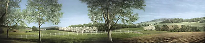 Keywords: prarie day farmland farm land spring light rustic dirt path paths road roads picket fence white clouds blue clear sky green flowering trees tree rolling hills hill