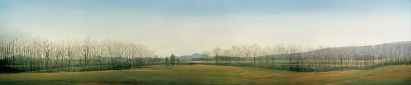 Countryside country landscape residential backyard view of distant winter trees and fields with no snow in a new home development in Virginia