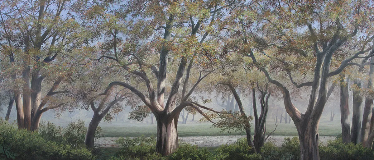 Keywords: Day daytime woods landscape lush green grass shrubs dense forest fall colored trees autumn leaves light blue sky pathway road