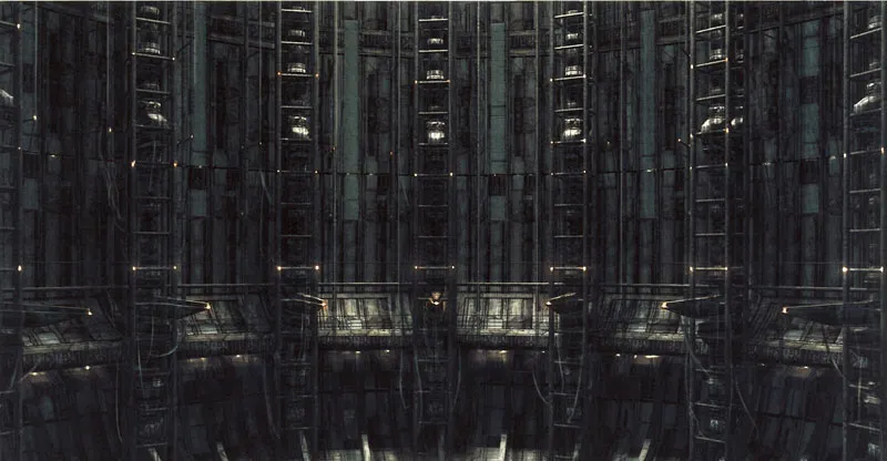 Keywords: interior interiors inside insides alien aliens ship ships space industrial green greens grey gray greys grays tone toned hue hues tones hued black blacks metal metallic ladder ladders spaceship spaceships