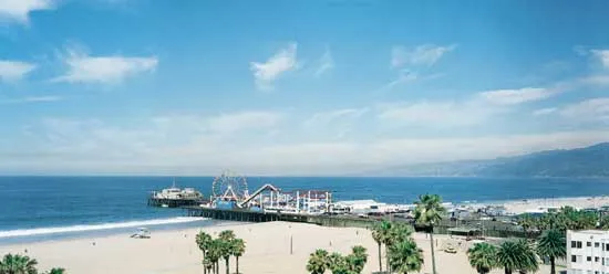 Keywords: ca california santa monica pier piers usa us u.s.a. u.s. united states of america north day sky blue cloud clouds clouded ocean oceans sea seas water waters shore shores line lines sand beach beaches rollercoaster roller coaster coasters rollercoasters palm palms tree trees building buildings themed theme park parks