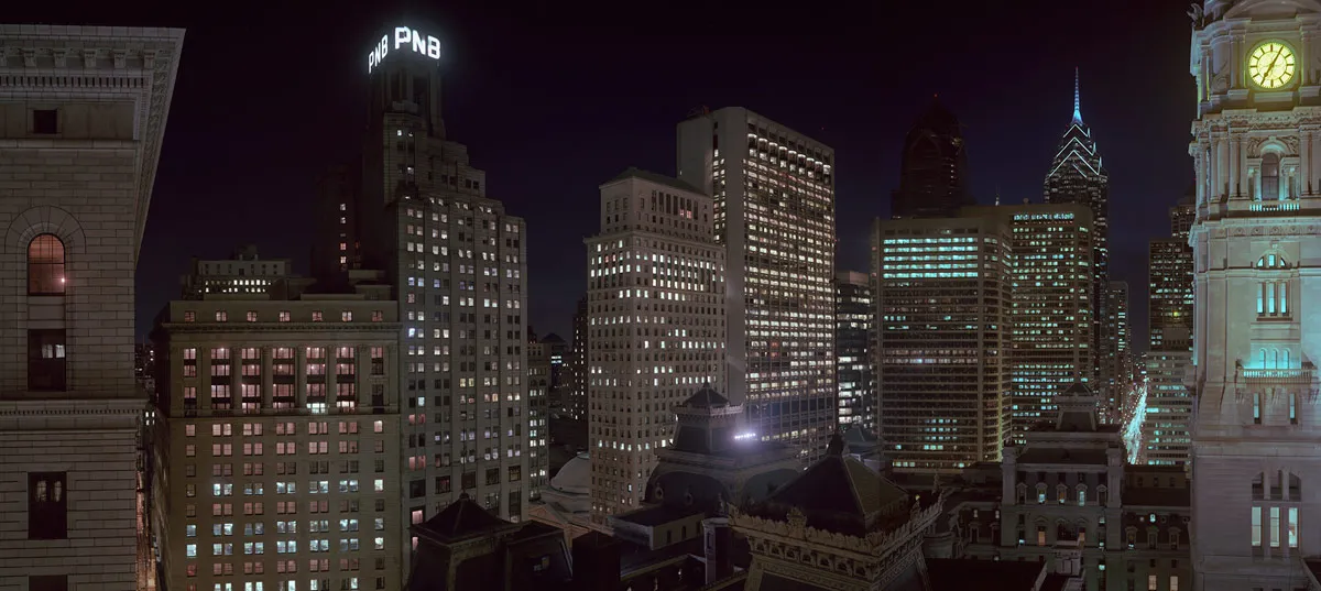 Keywords: night nighttime skyline Philadelphia PA Pennsylvania building buildings modern glass windows historic Philly blue sky clouds skies cloudy Phil Penn architecture