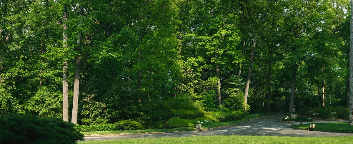Keywords: day daytime leaves driveway green trees tree blue sky grass garden cottage Atlanta GA Georgia spring springtime leaves fountain lamp post