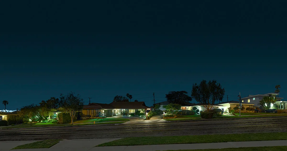 Keywords: night nighttime residential homes green grass trees blue sky street ground floor lights