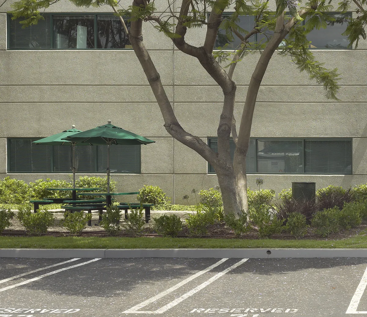 Keywords: day daytime parking spaces lot tree branches trees green grass office building 2 two-story ground floor FL office park picnic tables umbrellas bushes shrubs