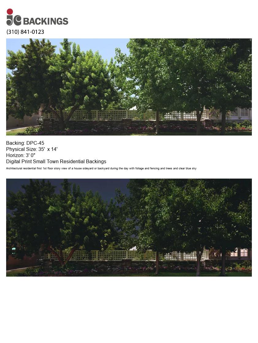 Architectural residential first 1st floor story view of a house sideyard or backyard during the day with foliage and fencing and trees and clear blue sky
