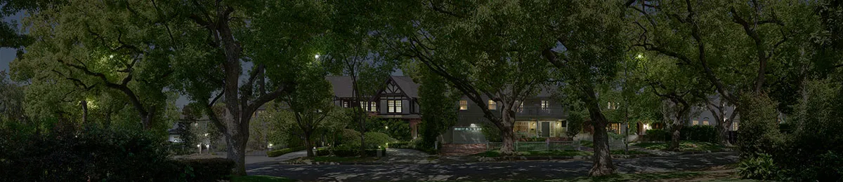 Keywords: Day daytime 1st FL first floor view of residential upscale neighborhood 2 second two story homes houses across the street road oak trees green grass bushes summer summertime blue sky