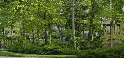 Keywords: day daytime stone lined driveway street road lush tall green trees tree blue sky grass garden cottage residential Atlanta GA Georgia spring springtime leaves summer summertime woods forest pine tree trees