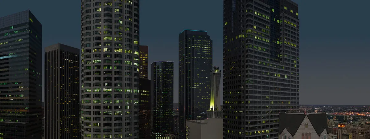 Night VIEW OF DOWNTOWN LOS ANGELES CALIFORNIA CITY SKYLINE WITH CLOSE UP VIEW OF MODERN OFFICE BUILDINGS FROM THE 29TH FLOOR