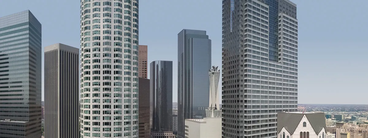 DAY VIEW OF DOWNTOWN LOS ANGELES CALIFORNIA CITY SKYLINE WITH CLOSE UP VIEW OF MODERN OFFICE BUILDINGS FROM THE 29TH FLOOR