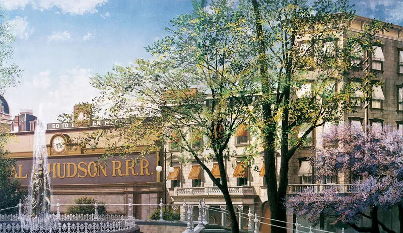 Keywords: hudson railroad rail roads road railroads train trains station stations commercial downtown downtowns town towns down city cities big large architectural architecture cherry blossom tree trees foliage building buildings bandstand bandstands band stand stands day blue clouds cloud sky fluffy white 1920 1930 1920s 1930s 1920's 1930's style styled stylized square squares park parks garden gardens us usa u.s. u.s.a. united states of america north northern fountain fountains