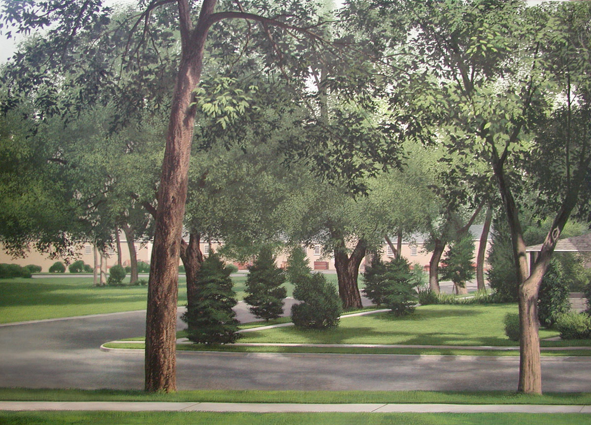 Keywords: daytime day time architecture residential suburban street sidewalk green trees houses homes yard yards small town