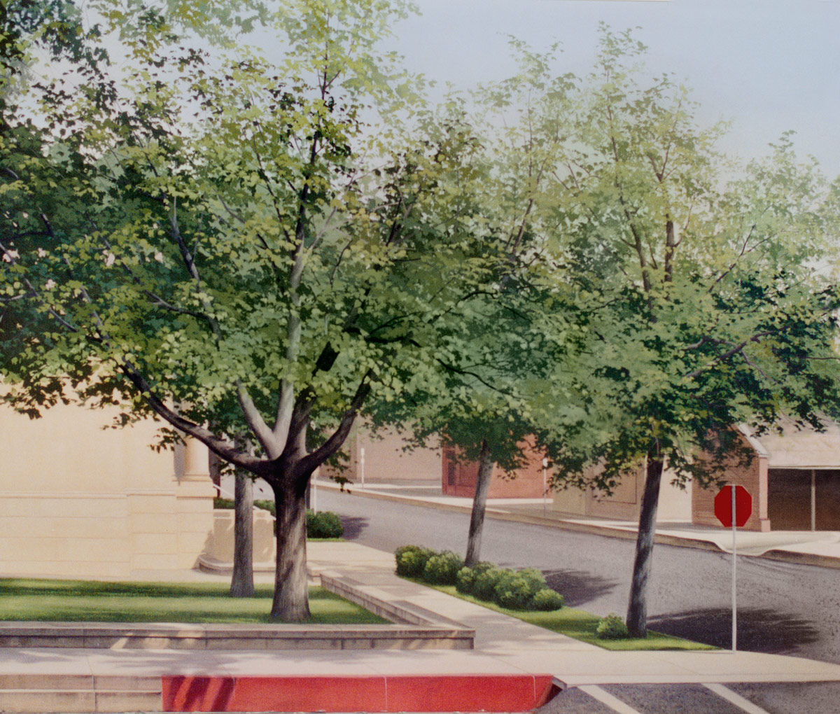 Keywords: street level commercial city street small or midsize town sidewalk curb green trees blue sky