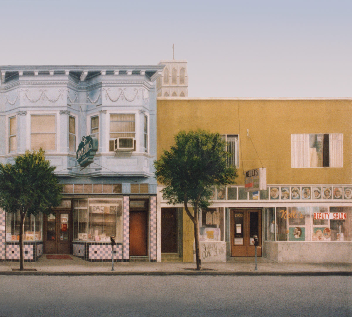 Keywords: street level commercial store fronts sidewalk street with curb parking meters trees blue sky daytime beauty salon