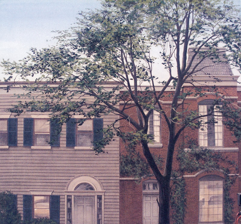 2nd floor view of architectural residential apartment building with a tree and a clear day blue sky