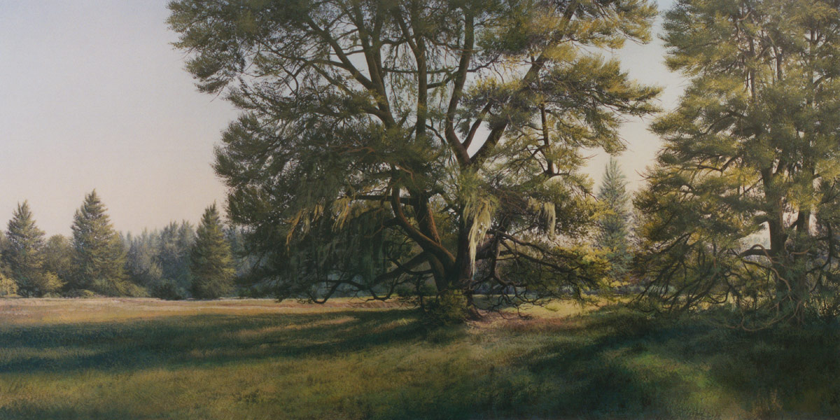 Keywords: day time summer landscape with green trees and blue sky and moss hanging from the tree limbs open field meadow country park