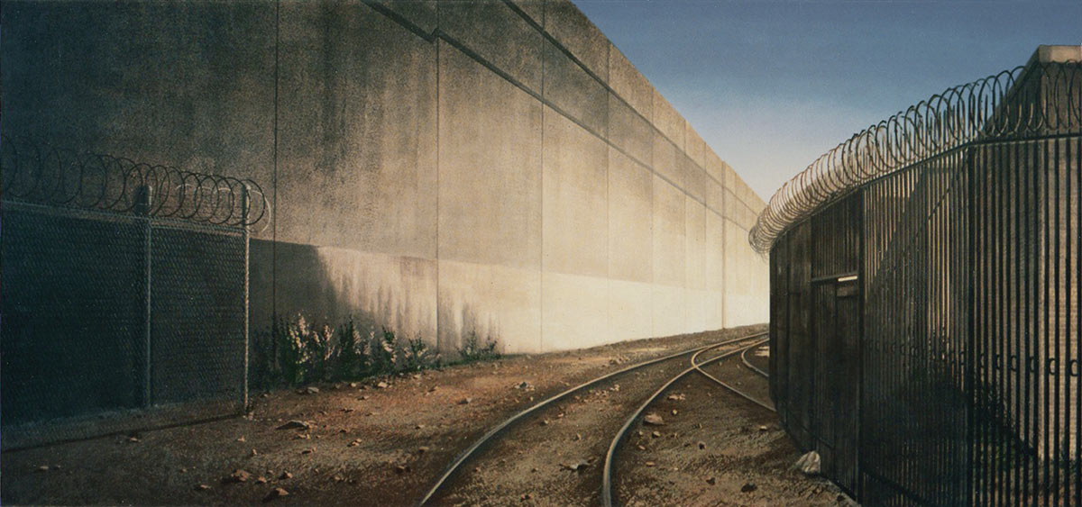 Keywords: ground level view railroad tracks night iron wires wired wire fencing fence gate gates fences wall walls dirt mud rock rocks path paths road roads transportation exterior