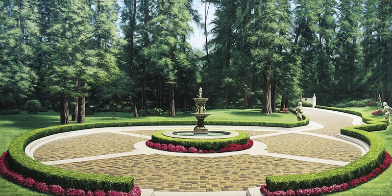 Keywords: front frontyard frontyards yard yards residential residence residences home homes hosue houses fountain fountains drive way ways driveway driveways day sky cloudless blue clear green trees tree greenery greens foliage flower flowers brick paved pavement circular circle shaped shape hedge hedges