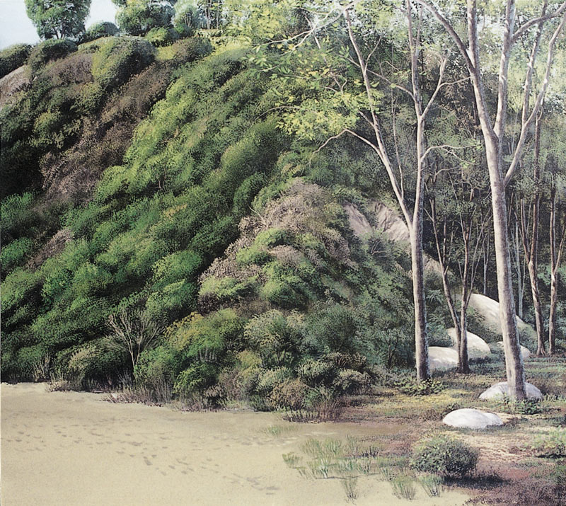 Beach landscape with cliffs and trees and foliage on a sand covered shore during the day in Paradise Cove in Malibu CA California