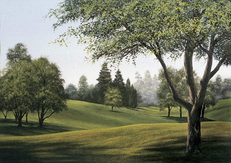 Landscape of a park during the spring or the summer during the day with green trees and foliage as well as a clear blue sky