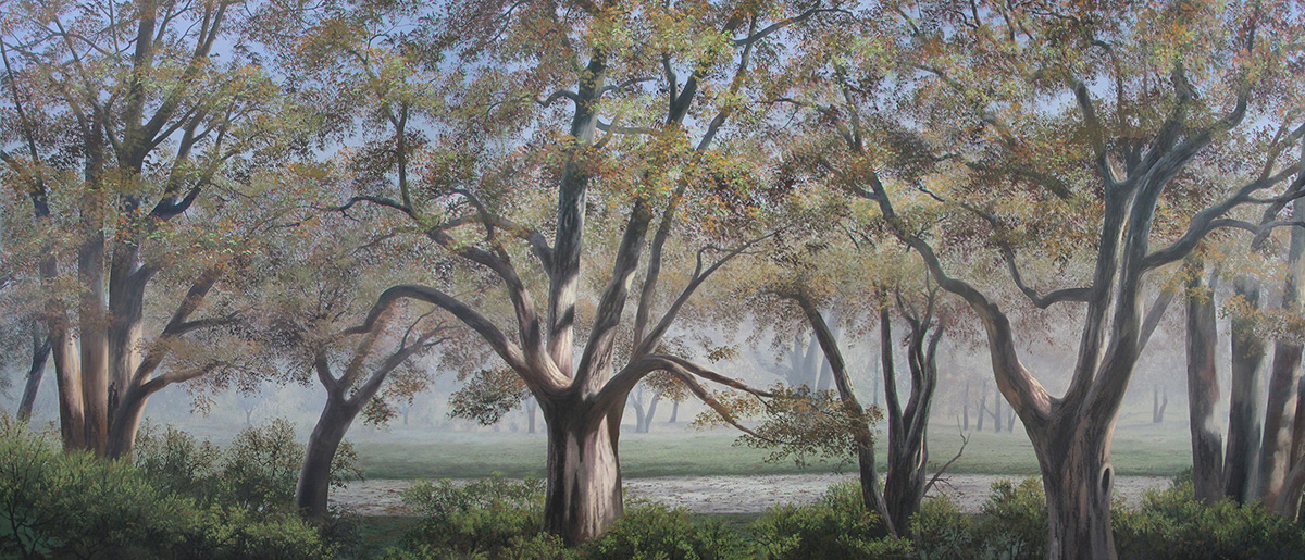 Keywords: Day daytime woods landscape lush green grass shrubs dense forest fall colored trees autumn leaves light blue sky pathway road