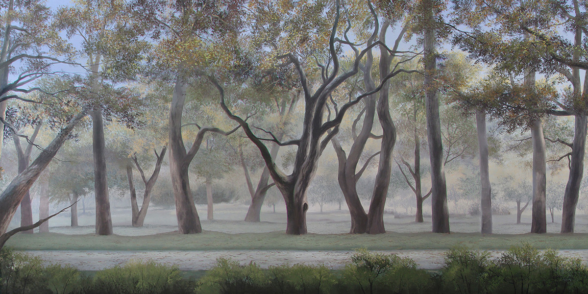 Keywords: Day daytime woods landscape lush green grass shrubs dense forest fall colored trees autumn leaves light blue sky pathway road