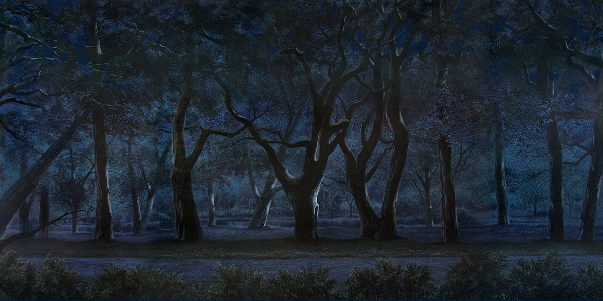 Keywords: Night nighttime woods landscape lush green grass shrubs dense forest fall colored trees autumn leaves dark blue night sky path pathway road