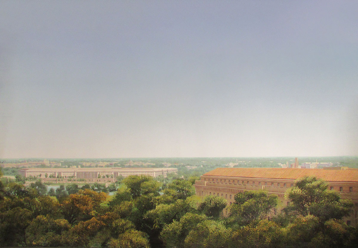 Keywords: Day daytime distant view of Washington D.C. skyline buildings above green tree tops treetops blue sky no clouds