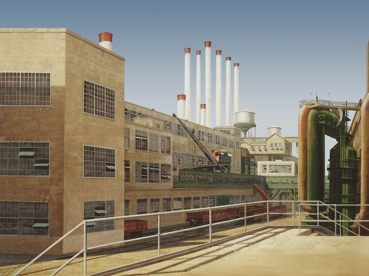 Keywords: Industrial Oil Refinery office buildings railings walkway smoke stacks water tower day daytime