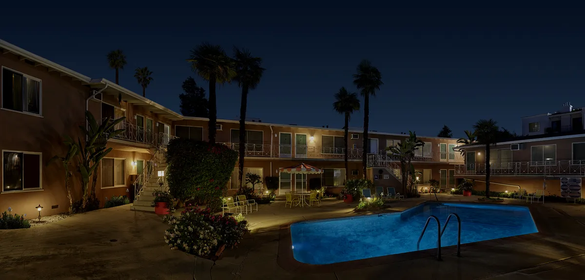Keywords: night nighttime apartment courtyard swimming pool palm trees blue sky lights ground first floor