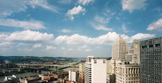 Pittsburg PA Pennsylvania skyline during the day with gorgeous blue sky and fluffy white clouds