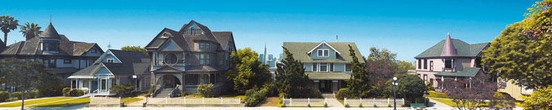 Day view looking across the street at victorian architectural houses house housing with green trees in a residential area neighborhood in San Francisco sf s.f. California ca with clear blue skys sky