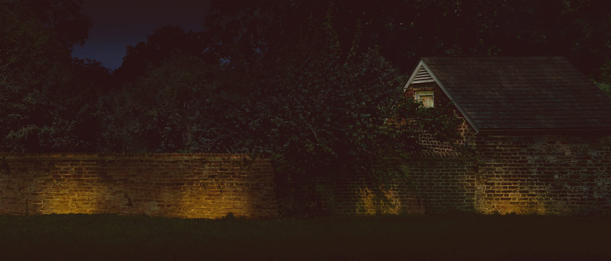 Night view of side yard in Richmond Virginia VA with garden house green grass brick wall and dense trees from the Westover Plantation