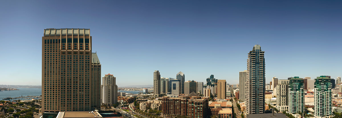 Keywords: day daytime city skyline San Diego highrise hotels hotel office buildings offices apartments downtown ocean water blue sky California CA SD