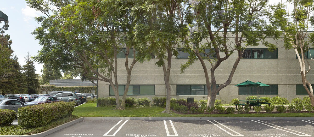 Keywords: day daytime parking lot trees green grass cars office building two-story ground floor office park