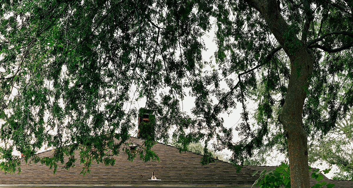Keywords: Day daytime view of residential residence back yard backyard fence top green trees bushes home house next door in Pasadena California CA