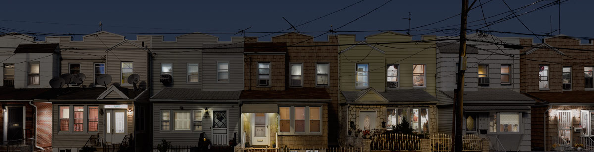 Keywords: Queens NY New York 2nd second floor view looking across the street at residential row houses blue sky telephone pole high wires night time