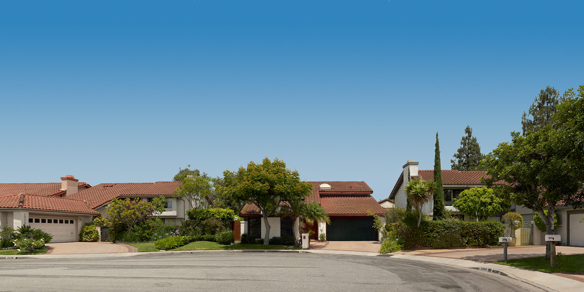 Keywords: View views looking across street Spanish style roof roofs tiles tile residential house houses frontyard front yard home homes green trees blue sky skies summer street level Caldasec