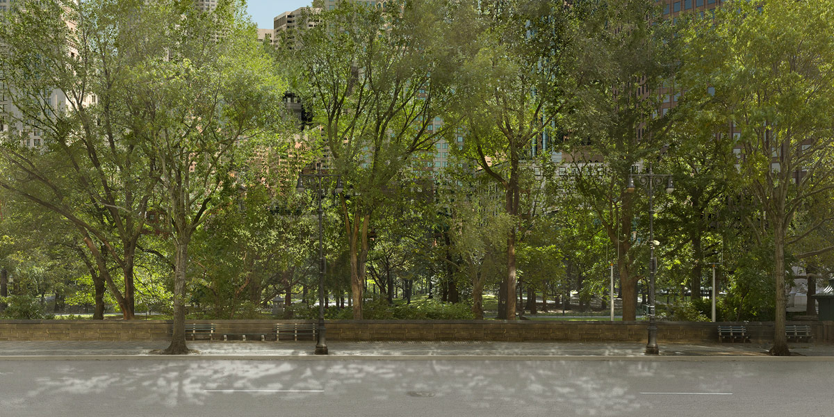 Keywords: day daytime trees park summer street sidewalk New York City NYC NY central park new york blue sky green tree lamp post posts street light lights large buildings park bench benches